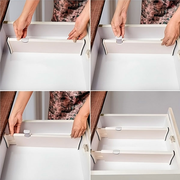Za samo nekoliko sekundi možete preurediti svoje neorganizovane fioke. Sa jednostavnom „pomeri i klikni“ instalacijom, organizacija nikada nije bila lakša. Samo postavite, prilagodite i zaključajte pregradu na mestu – bez alata ili lepka.