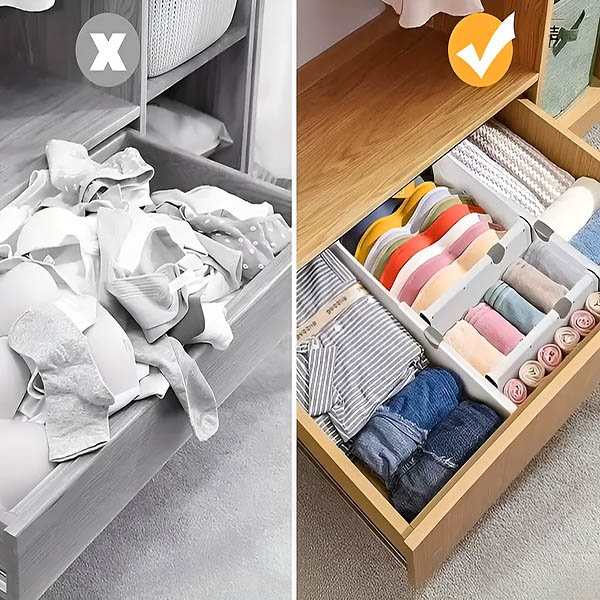 Ne samo za fioke – ove pregrade su odlično rešenje i za police. Koristite ih za organizovanje knjiga, kozmetike ili kancelarijskog pribora na otvorenim policama kako bi sve ostalo na svom mestu.